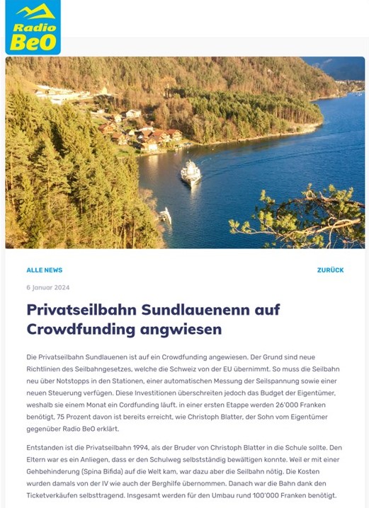 Die Nationalratskandidatin (2023), Gemeinderätin in Beatenberg, sowie Co-Präsidentin Beatenberg Tourismus Linda Wachtarczyk, hat einen Bericht in der «Drachebärgzytig» (Februar 2024)über unser gelungenes Crowdfunding der Seilbahn veröffentlicht. Wir freuen uns über das entgegengebrachte Interesse und die Gelegenheit in der «Drachebärgzytig» einen Platz bekommen zu haben. Herzlichen Dank dafür!
